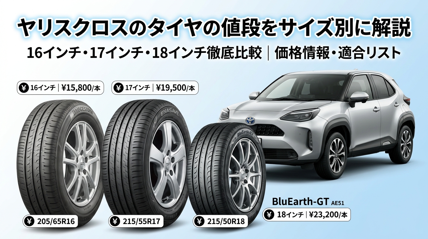 まずは、ヤリスクロスの純正タイヤの基本情報からサイズ別の値段相場、そしてブリヂストンなど人気メーカーの価格やおすすめタイヤまで、順番に見ていきましょう。