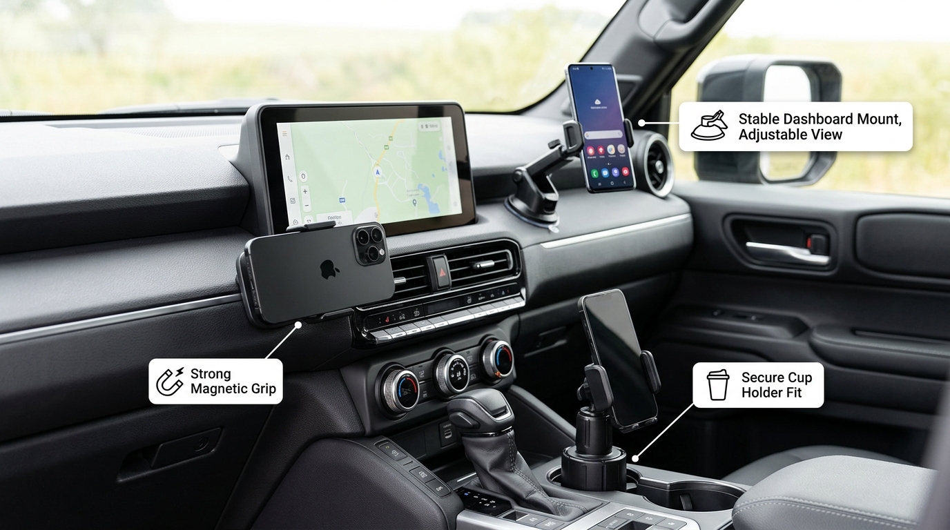 ランクル250はダッシュボードが独特のデザインのため、一般的なスマホホルダーが取り付けにくいケースがあります。また大型ボディでの運転中にスマートフォンでナビを使いたい方も多く、使いやすいスマホホルダーの選択は快適なカーライフに直結します。提供されたHTMLテンプレート
