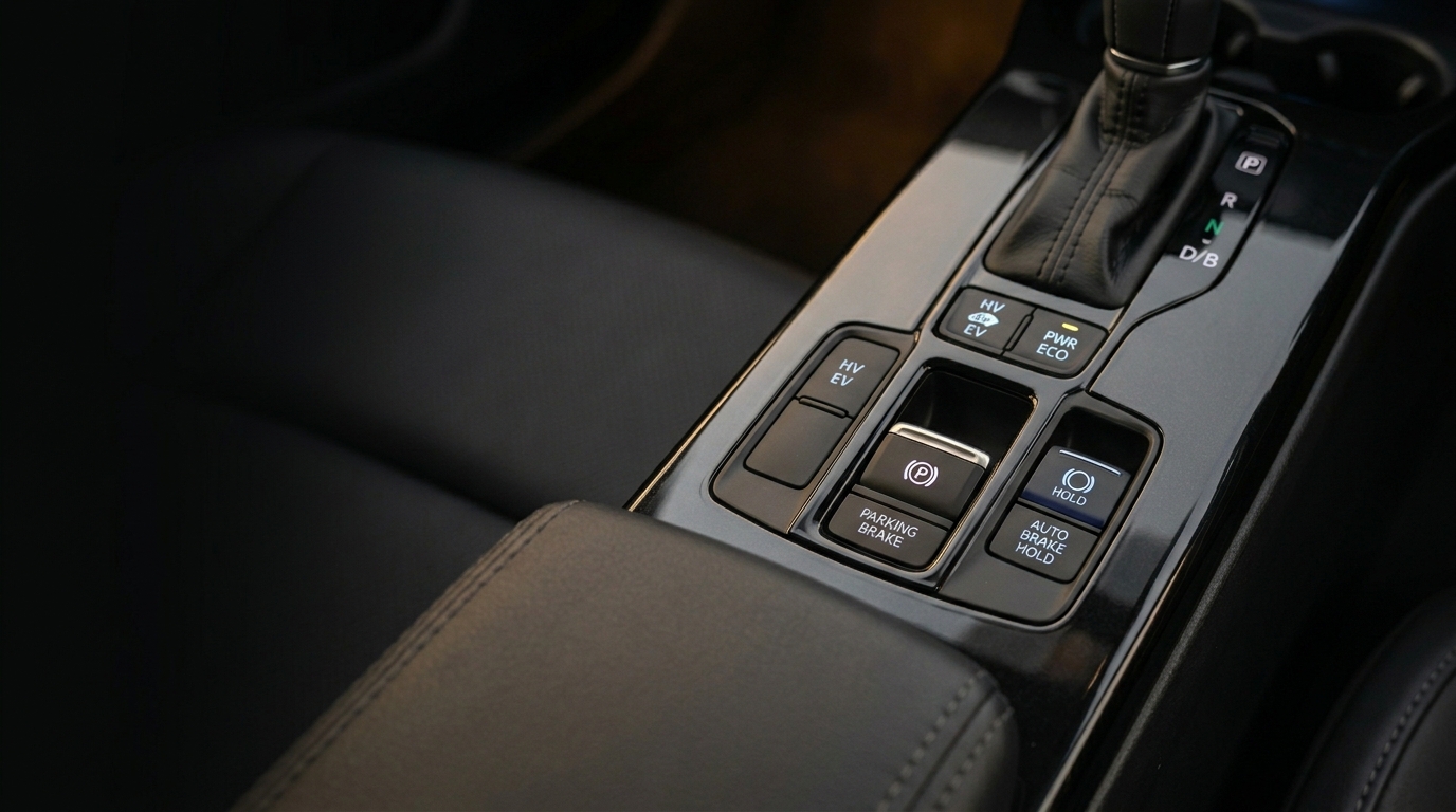 物理的なレバーはなく、センターコンソールまたはダッシュボード付近に設置された「P」または「EPB」と書かれたスイッチボタンで操作します。